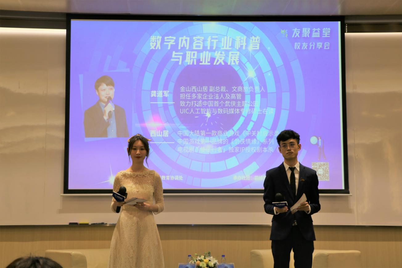 3月29日晚七点,由四维教育协调处主办、四维校友社承办的“友聚益堂”校友分享会在T2-102举行。此次校友分享会,邀请了金山软件西山居副总裁、文商旅负责人、UIC人工智能与数码媒体专修在读硕士龚道军先生作为当晚演讲嘉宾,活动内容包含校友分享、嘉宾访谈、现场问答。龚总向UICer科普了数字内容行业和职业发展的相关知识,引导同学们深入的了解数字化和职业发展的相关内容,帮助他们更有效率、目标的规划自己的大学生活,为以后的职业方向指明道路。