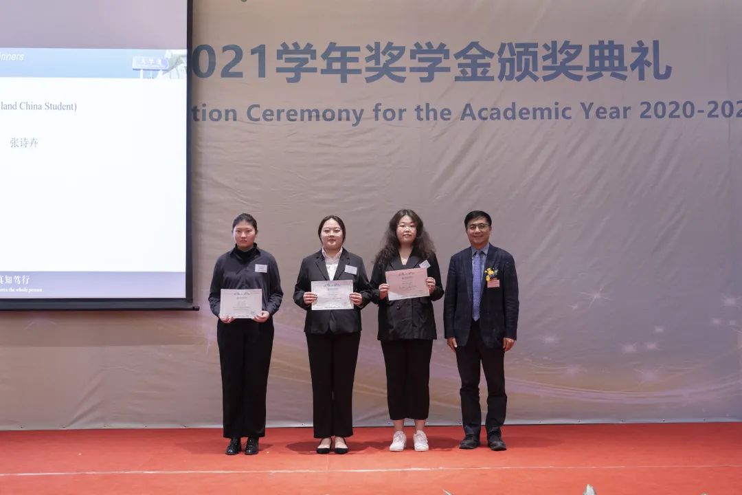 汤涛校长为获得古楚壁伉俪奖学金(内地生)同学颁奖,包括苏隽桦(20级ELLS),王羽冉(19级AE),张诗卉(18级CTV)(左起)