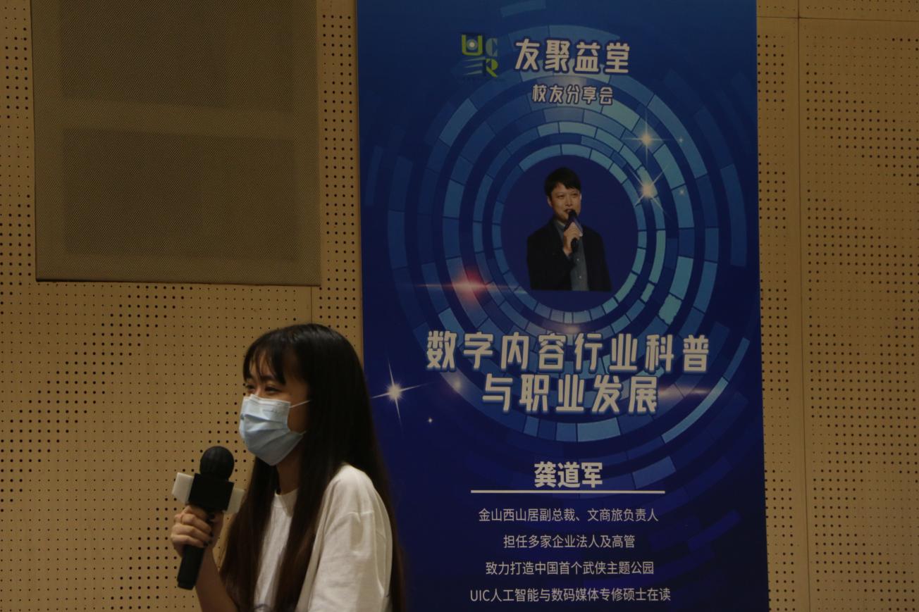 3月29日晚七点,由四维教育协调处主办、四维校友社承办的“友聚益堂”校友分享会在T2-102举行。此次校友分享会,邀请了金山软件西山居副总裁、文商旅负责人、UIC人工智能与数码媒体专修在读硕士龚道军先生作为当晚演讲嘉宾,活动内容包含校友分享、嘉宾访谈、现场问答。龚总向UICer科普了数字内容行业和职业发展的相关知识,引导同学们深入的了解数字化和职业发展的相关内容,帮助他们更有效率、目标的规划自己的大学生活,为以后的职业方向指明道路。