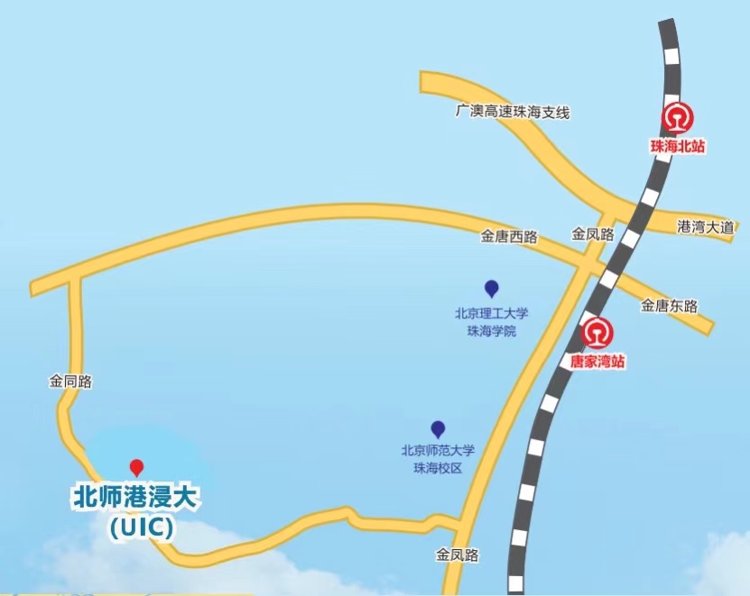 乘广珠城轨到达珠海唐家湾站 ,出站后,换乘出租车到达北师港浸大校园(6.9公里,行程约15分钟)。