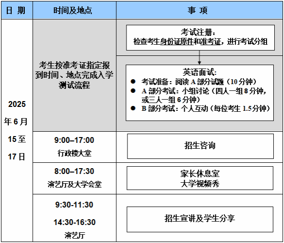 正式考试:考试准备结束后,考生携带笔记纸和A部分试题根据座位标签就坐于正式考试区,考试随即开始。考生前来学校参加考试前,请预先仔细阅读附件二“考生须知(Instructions for Candidates)”。学校入学测试将对学生的语言流利度、沟通策略、逻辑思维、团队合作和组织能力等方面进行全面评估,以选拔适合北师港浸大博雅教育特色和英文教学环境的学生。考试全程录音录像。