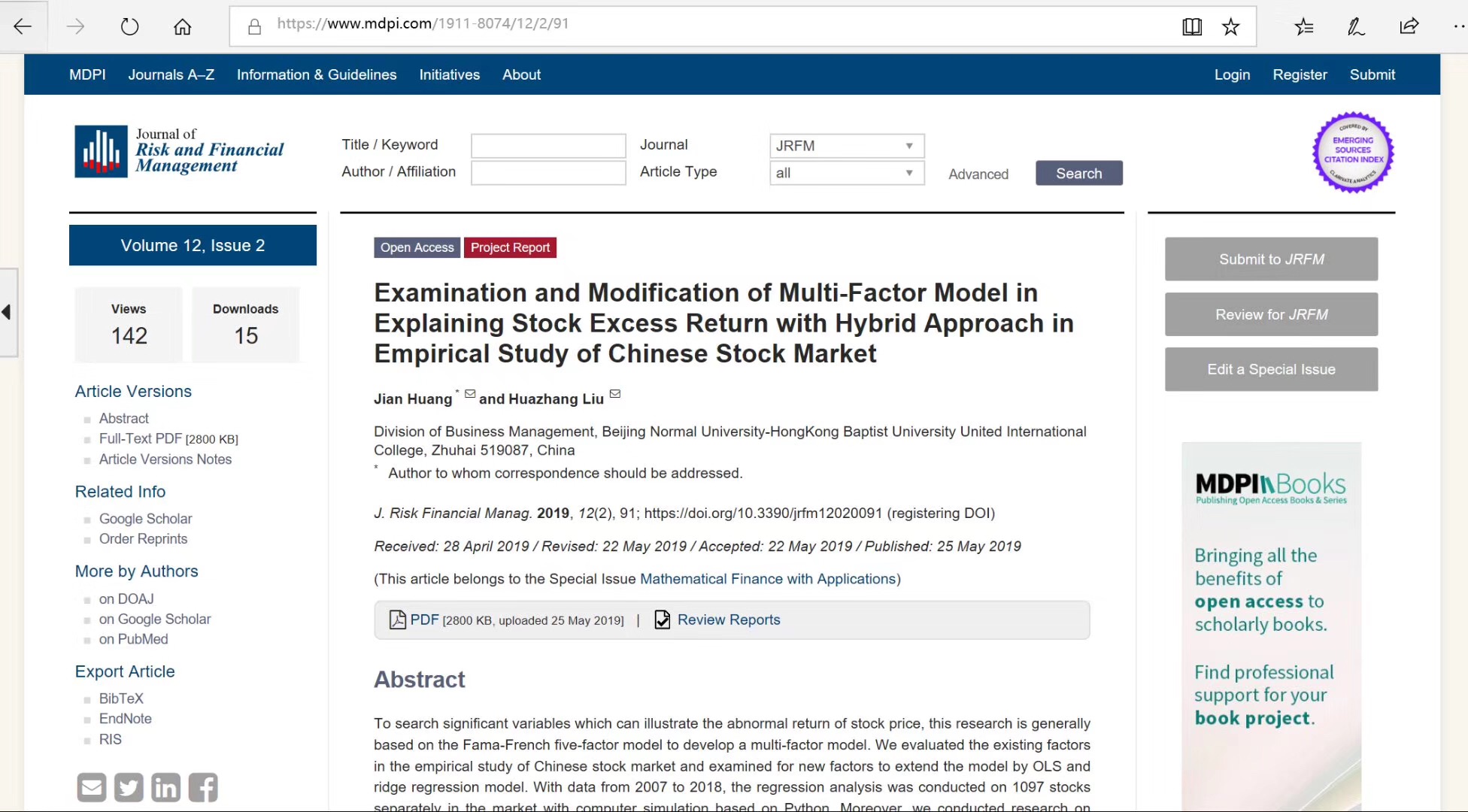 毕业之际,黄坚的毕业论文《多因子模型解释股票的超额回报的检验与修正:混合方法在中国股票市场的实证性研究》也在国际期刊《风险与财务管理杂志》(Journal of Risk and Financial Management,属于ESCI期刊)发表。