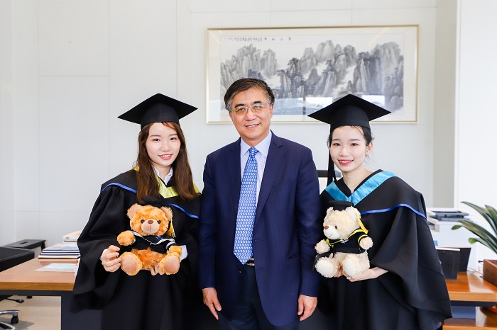 李嘉智(右)与李嘉慧(左)与汤涛校长合影
