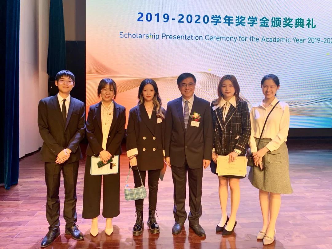 在2019-2020学年奖学金颁奖典礼上,获一等奖学金的卫萱(左三)和同学与汤涛校长(右三)合影