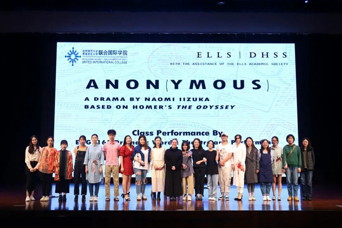 2019年,闵于思(右十)和同学在大学会堂完成了现代戏剧表演《Anonymous》