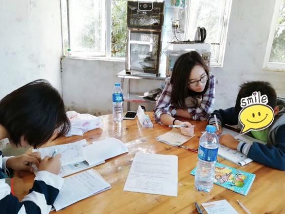 邓蕴僖(中)给外来务工人员子女辅导作业