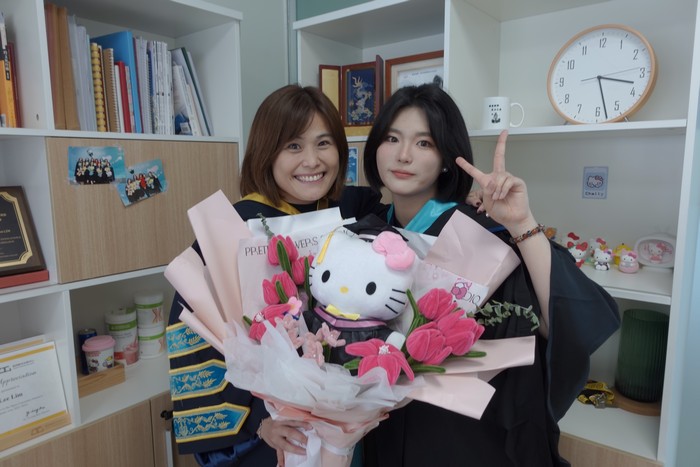 丁子怡与传播系副系主任许夏营(上)、公共关系与广告学专业副教授Chally Lim(下)合影