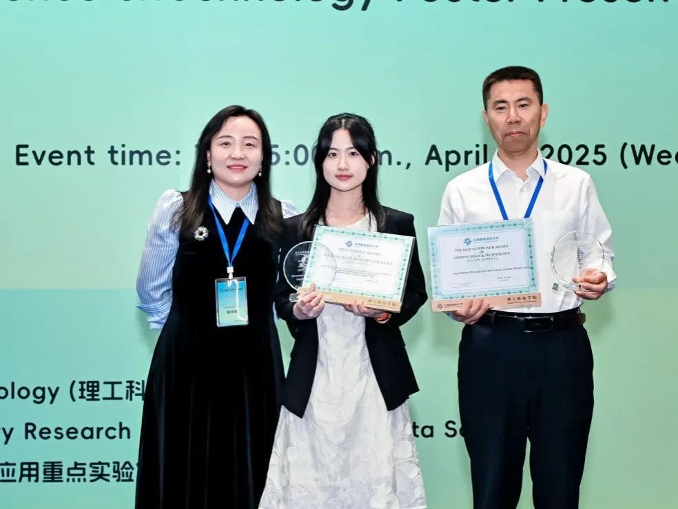 在理工科技学院海报展上,任咏忻获得专业最佳海报奖(左起:杨华艳教授、任咏忻、徐宝军教授)
